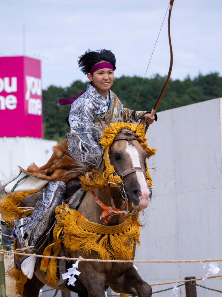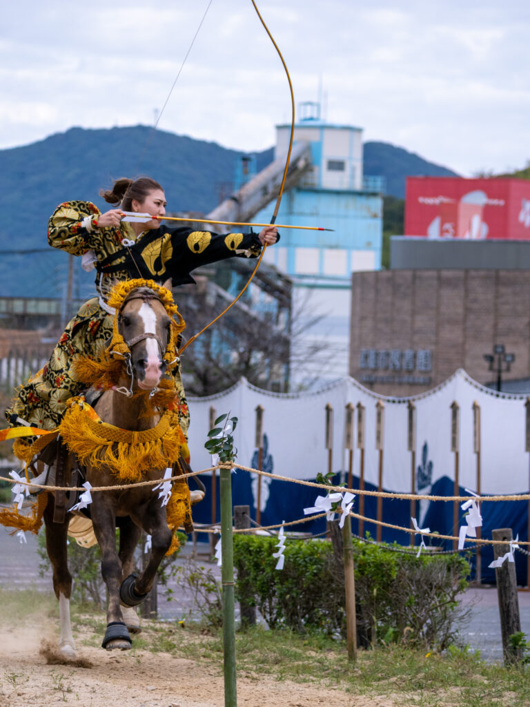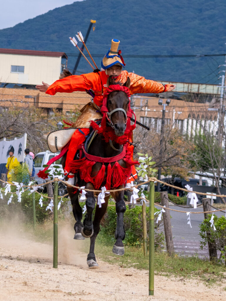 午後の本番では、勇壮な馬上から次々と的を射抜く見事な技が披露され、